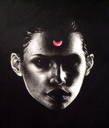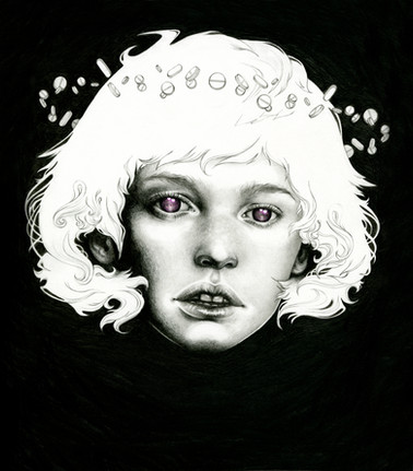 stunning composition, i love the contrast of the portrait and the characters around the edge, kind of cute but a bit creepy at the same time.