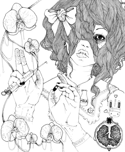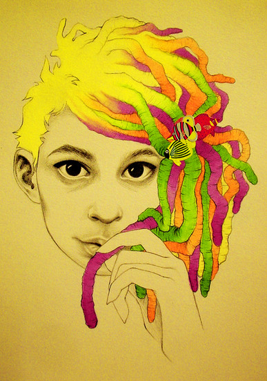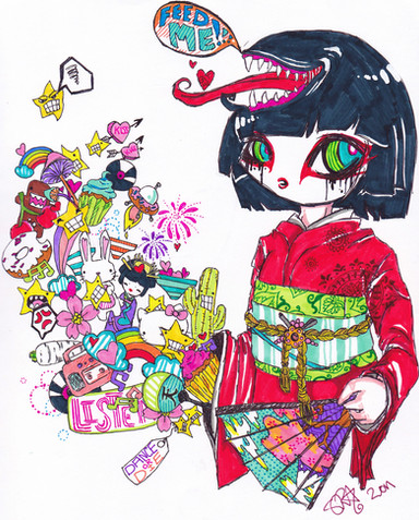 really like the juxtapozed b+w detailed drawing with the bright colored japanese designy imagery.