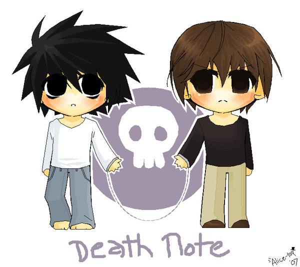 aww...little Light and L. They look so cute~ They always do, no matter what chibi you draw them in, rather they're mad in the picture, not. It's cute. I love L the best. Death Note is awesome. I want those buttons!