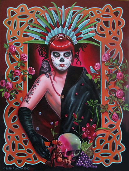 This blows my miiiiind, man. Those colors are incredible, this is exactly why I love Day of the Dead-themed art so much. Also, I need to make a headpiece like that. And dude, you did every scale on that snake, and his fangs are an excellent purple. And that hair, man. And I really like that the eyes are half-closed. This picture is so crazy.