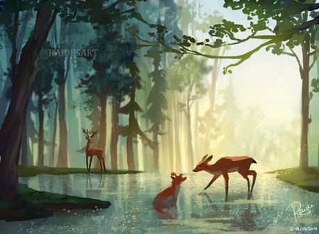 #birds #digitalart #raide #raidesart #forest #fox #illustration #landscape #scenery #waterfall