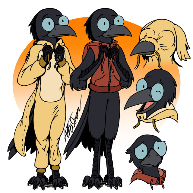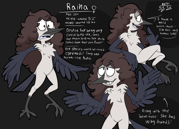 #animal #anthro #avian #bird #brown #cartoon #cartoony #character #corvid #crow #curly #feather #feathery #female #fursona #girl #hair #happy #nose #oc #original #persona #pointy #raven #reference #scared #sitting #araina #birdsona #originalcharacter