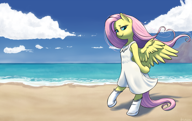 I can see some weirdness on the left thumb, but other than that, Flutters looks like she's ready to do some serious wave ripping.Β And I can't help but think she's kinda hot.Β Must be old habits... Never mind.Β *deep voice* I don' wanna talk about it.Β I've beaten those nasty things long ago if you know what I mean.Β Aaaaaaaaanyway, outta that and into critiquing.Β The only thing that I can really see that's wrong with this is the odd shape on Fluttershy's left thumb, and the hand by her neck seems to widen the shoulders a little bit, but that's really hard to correct.Β And the angle is very unique, makes it look like there's more action there than just a simple stroll along the beach.Β And Fluttershy does seem to look like a real angel almost.Β It's a great piece.Β And I think I might use a similar technique to how you made the beach dress in some more pieces of mine that involve that sorta thing.Β Translucent clothes are really tough.Β