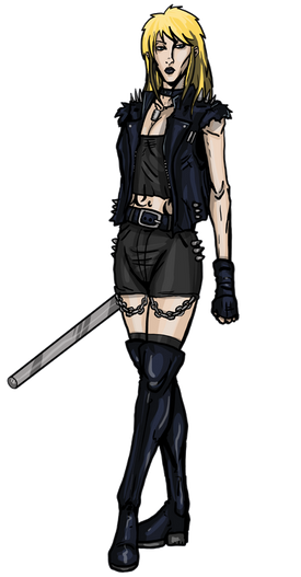 I see she has a nice pair of boobs. great job on her dress and those lovely boots.