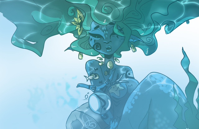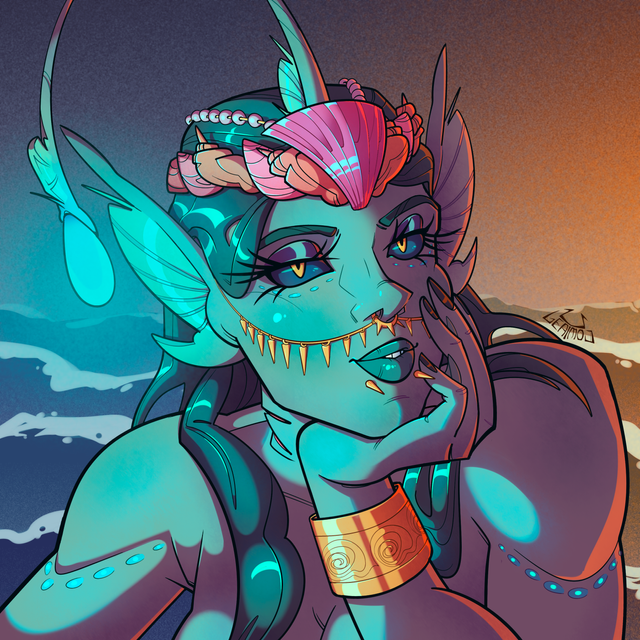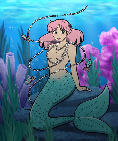 Hand drawn with ink and color in photoshop. I drew the base illustration for this about 6 months ago and had it kicking around in my sketchbook forgotten. I had this concept of a mermaid who collects human doodads like Ariel, but used them for body decoration. In the Hans Christian Anderson book the merfolk punch holes in their tails and dangle shells from them, which seems pretty punk-rock to me.Related content