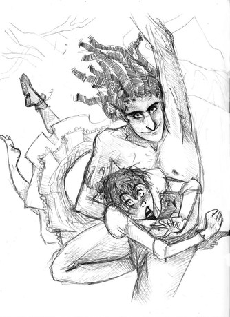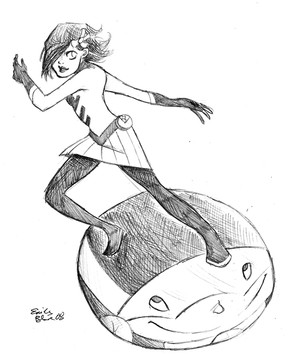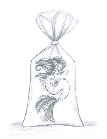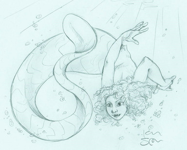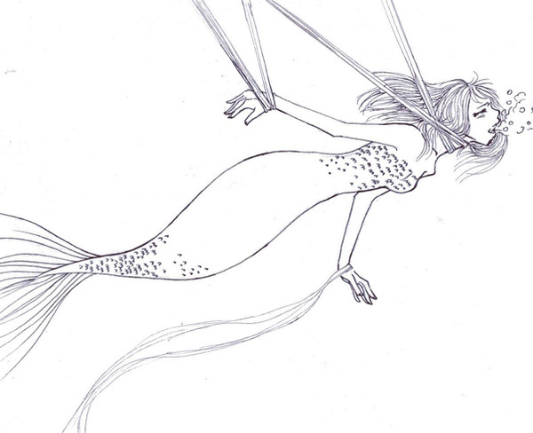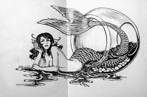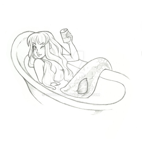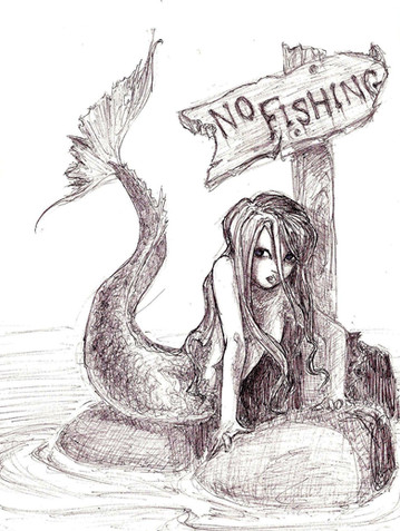 Drew this at work. (I work in a fish store, hence, fish-inspired doodle.) I hope I have time later to re-draw this and color it, 'cause I'm likin' the concept, but not her left hand. Oy. Them's the troubles with pen doodles: no erasing for you!Note the seaweed bra. Yeeeeeeah.