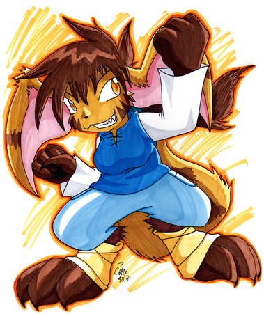 Excellent work there!I love action poses and that coupled with the expression came out really well!I can certainly see her doing this over prices for certain delectable foods though,heh!(What's a comic character without a few quirks?)