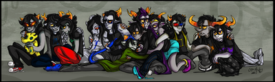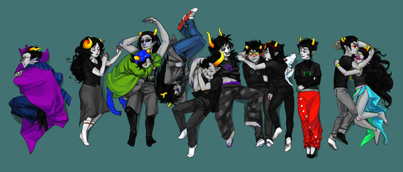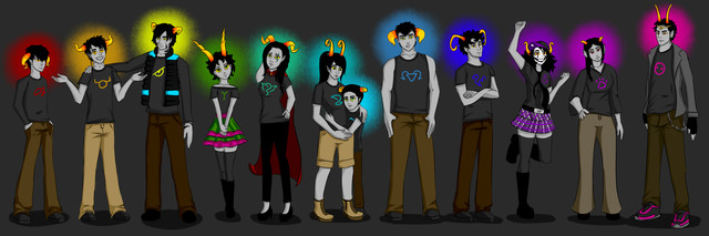 So here we have Eridan, Feferi, Tavros, Gamzee, Equius, Nepeta, Terezi, Vriska, Kanaya, Karkat, Sollux(Thollux >3>), and Aradia.