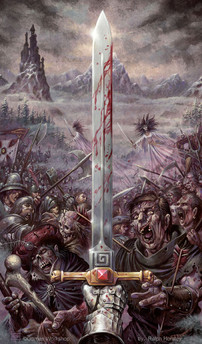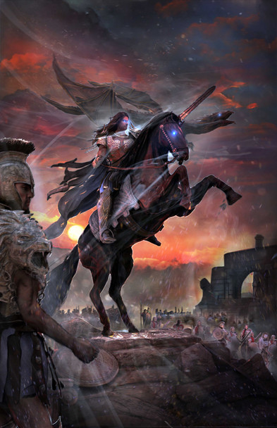 This piece shows a Goddess rearing above a battlefield. I wanted to carry the feeling of mist into the figure to help create the air of a supernatural apparition, this was achieved by blurring and softening the edges of the figure. The cloak is a key example as it dissolves into the background.