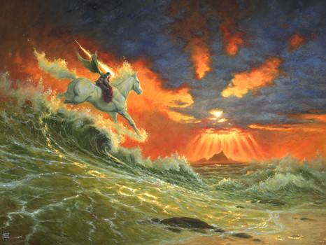 The goddess and her horse look larger-than-life. The effect of her cloak fading into sky and her mount's ankles fading into the ground make for a visually appealing focal point!
