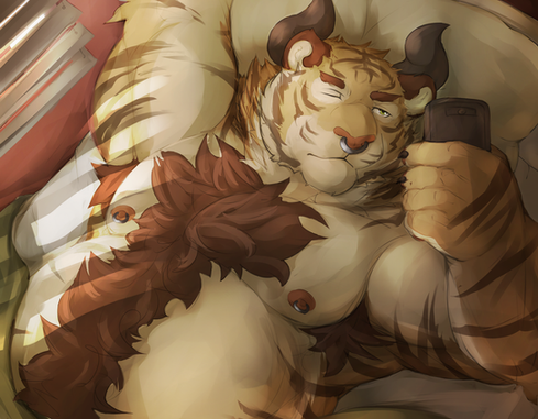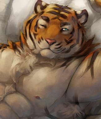 Hehe cute and sexy, that's how I like my tigers. XD Gosh, I love this drawing a lot, Ralph looks very good from this angle and I like the idea of drawing him like this and with this pose, being playful and cute, the blinking eyes makes the top of the cake.