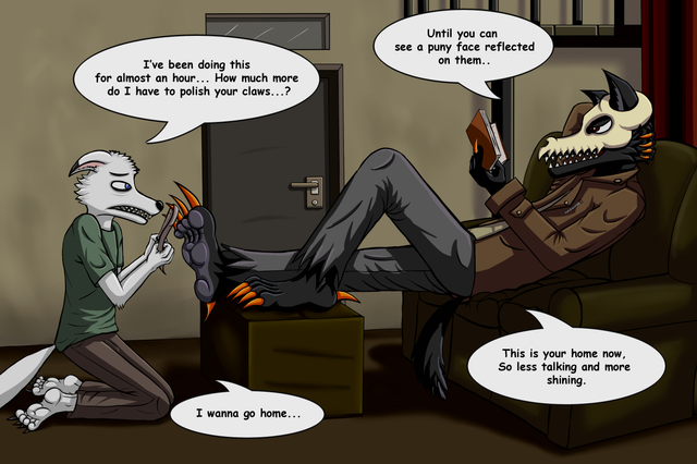 After polishing the skull head wolf toe-claws, the arctic fox was told to continue by giving a massage to his perpetrator’s feet; being unable to do nothing but obey, the fox set his hands on the feet in front of him and started to rub them shyly.“Put more effort, I can barely feel your touch down there.”