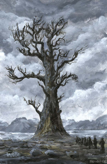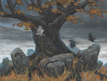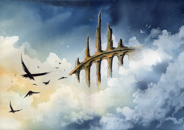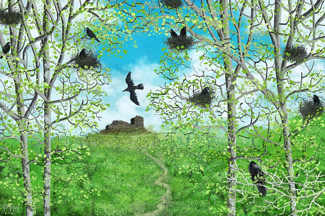 I liked the idea of concealing the trunk in clouds like it might float like the Laputa city tree in the film, or grow beyond the cloud cover. So birds were a must.