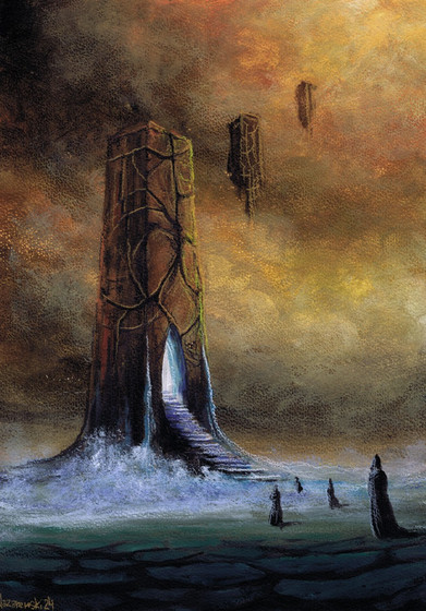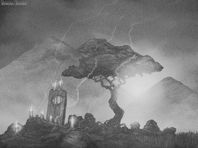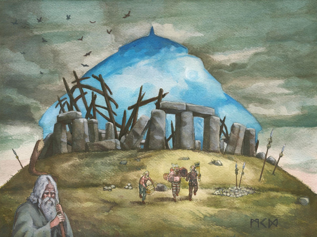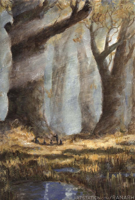 This is the only one from the series that have the Tiny Peopleβ’ that we all put in for scale comparison. I think they might be cultists - I hope they have nothing sinister in mind. It's also the (mostly) only one without any leaves, and I put it in my series on purpose because I easily lose track of all the myriad of tiny branches. The brush I used was a hogshair flat with only a few hairs dipped into pretty dry paint to rake over the handdrawn larger branches. It needed some overpainting of the thickest strokes, and I think all things considered, it worked.