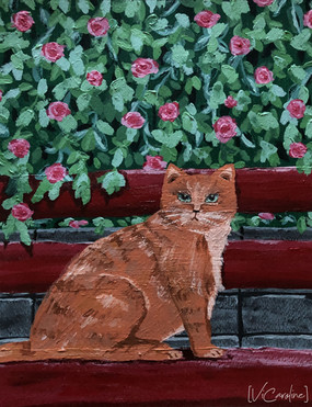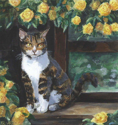 #acrylicpainting #cat #flowers #home #petportrait #sittingcat #sleepingcat #summer #tortie #traditionalart #yellowroses #climbingroses #kitty