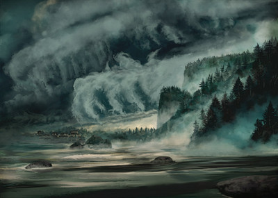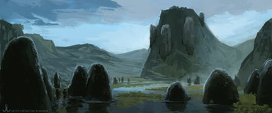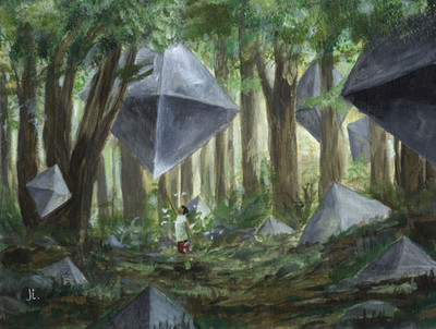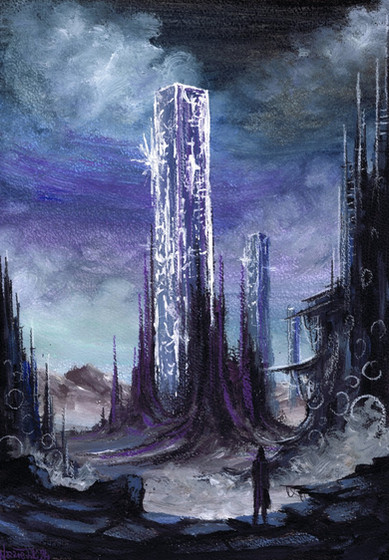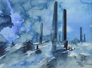 "All the cubes had turned into only smaller cubes, so eventually the natives had stopped trying to smash them, but still made it a point to not accept the angular tyranny."Another painting based on a digital study. Using traditioanl media however enable me to use nice materials like the gold and silver metallic watercolour pencils that mkae the patterns on the cubes as well as the orb (or egg, since it's egg-shaped) above the figure's head. It's subtle, but at an angle it's very nice, just as it is to have these options available.