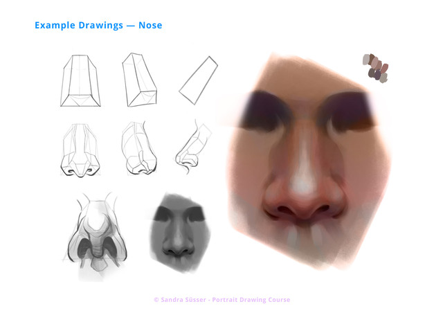 There are many details about noses; highlights, creases, skin issues etc. Please, forget beauty ideals - people with long, hooked noses are pretty, too.Since noses are sticking out, they are the first to be injured, cut, or sunburnt. Broken noses are lopsided and knobbly. Rough or old skin shows with large pores. There's often a dip in the tip where the cartilages meet.