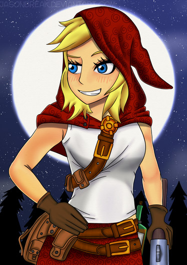 Kind of reminds me of Baby Bonnie Hood from Darkstalkers. (maybe it's the whole badass red riding hood look, could just be me though) Interesting!