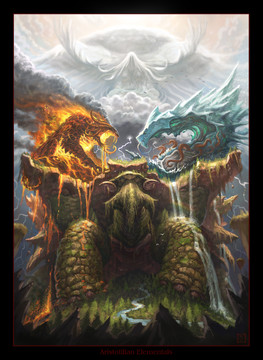 Holy, exquisitely fantastic! This Space Turtle Asura is stunning and The Scenery looks incredible! The expression, waterfalls,water, sun,moon. sky, clouds, designs, atmosphere, textures, body, atmosphere, hues, haze, movement,composition, concept, uniqueness, colors, lighting, style, and other details are also wonderful! Magnificent work!