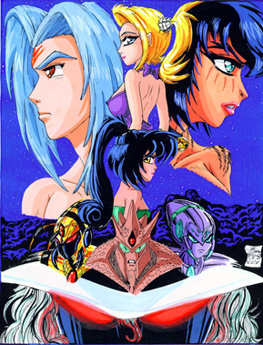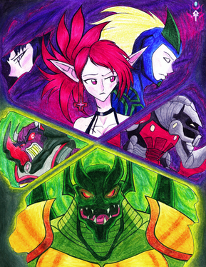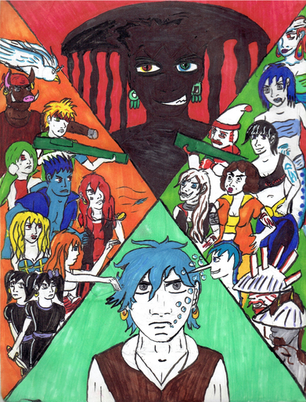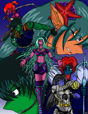 I think your coloring and collage format are excellent! The juxtaposing of the characters are done well, although Daecon's face is a little hard to see. I'm going to assume that's Dot on the bottom left and AndrAIa along the top. Your strong anime style makes it abit hard for the cast to be recognized, but then again that's an expected feature of anime.