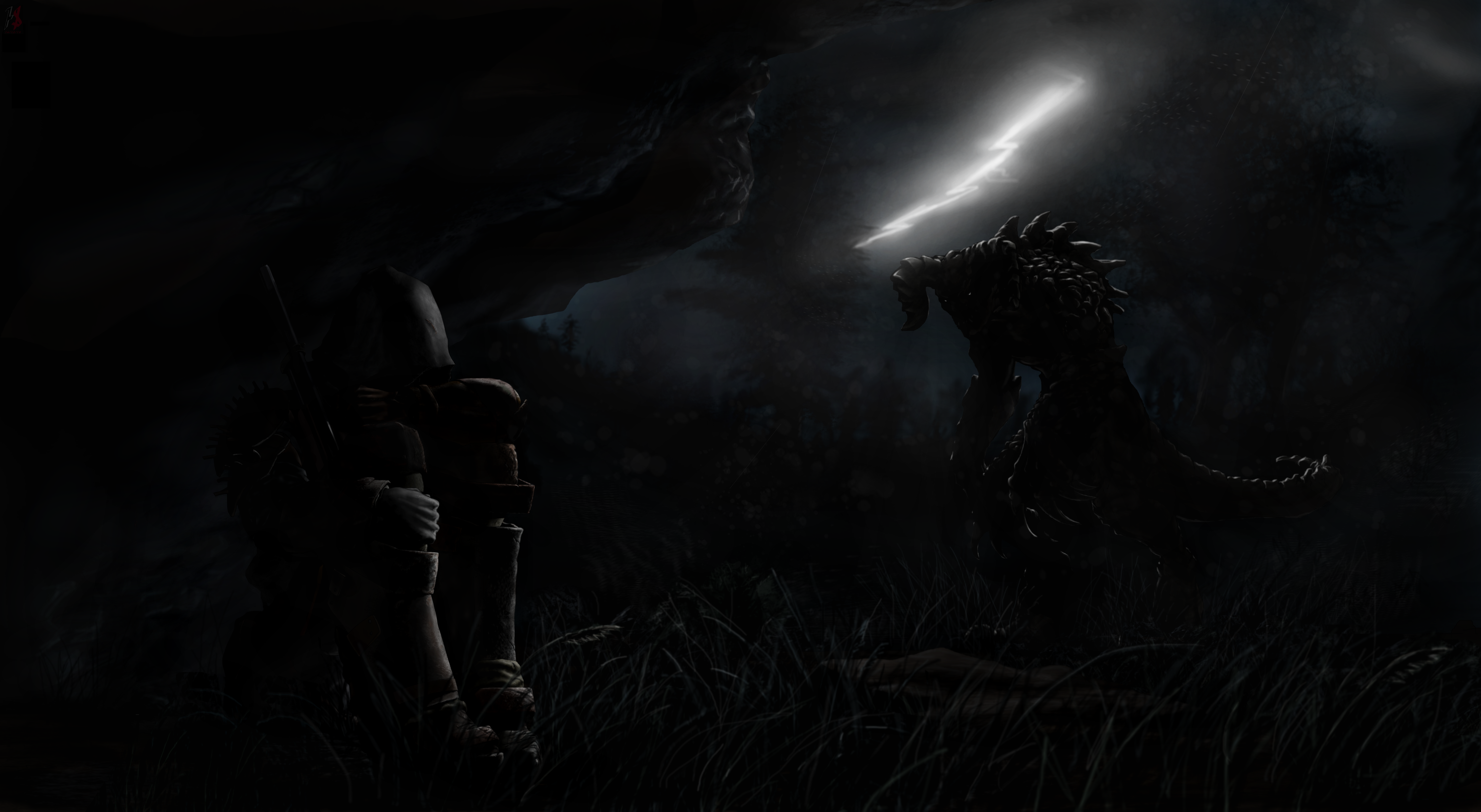 He started moving then stopped, but then slowly lowered his sword and took it at the blade with his left hand, the Creature following his every moves with it's glowing eyes.