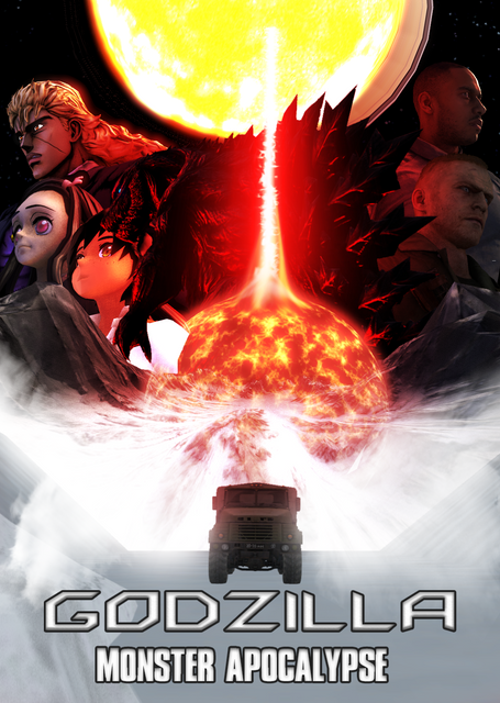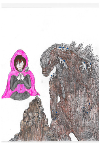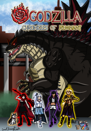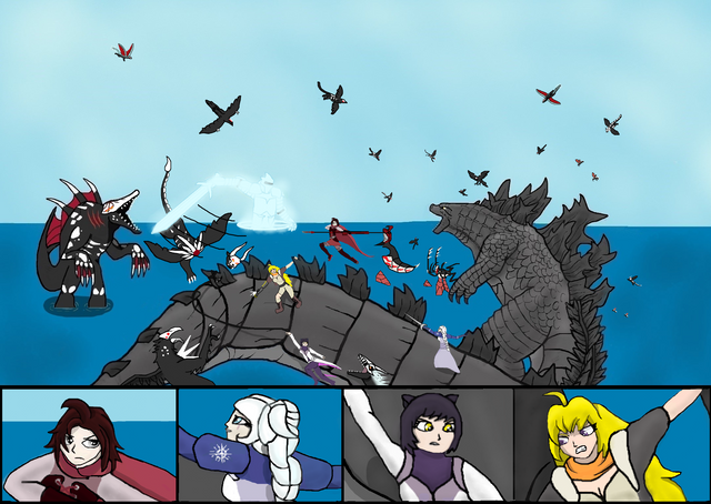 Mikasa Ackerman (attack on titan), Ryuko Matoi (kill la kill), Ruby Rose (RWBY) and Godzilla 2014