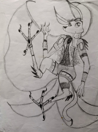 GOD i love this character so much!She doesn't have a name yet, but i'm working on it. So! she is from my aforementioned worldbuilding thingie. BUT. She is special, she is a mix between a Cerdoni and Miazeara, these hybrids don't usually live long and are born with disfigurements, such as this character. She is tecnically hemafrodiric, for example, female Cerdoni only develop breasts after puberty or only after having young, this one will never do so, that's really Her only genetic defect and health wise she is pretty well. Β She loves to dance and her appearance and skill have turned her into a small celebrity in her homecity and sorrounding territories.