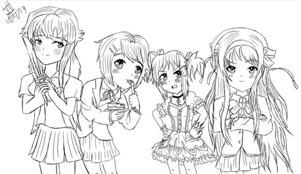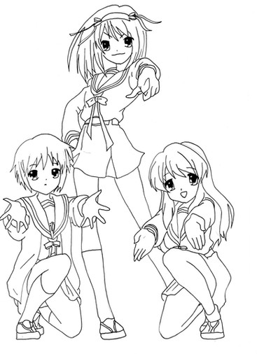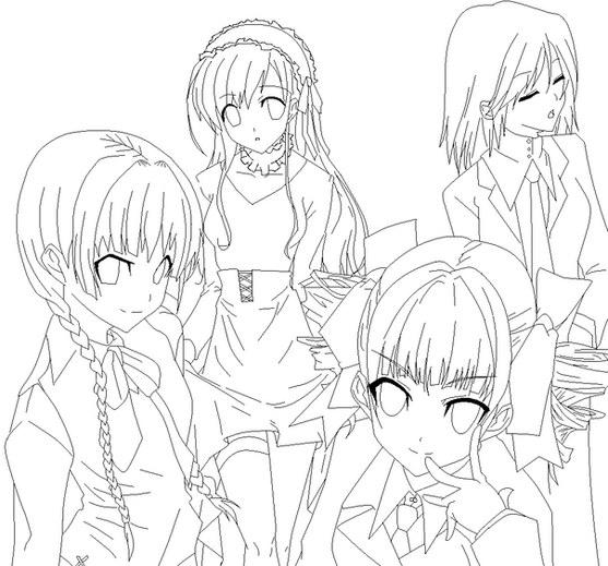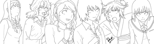 this is a lined-art version of this: [link ]*from left to right: Morishima Haruka (Amagami SS), Nakamura Yuri (Angel Beats!), Tsukasa Hiiragi (Lucky Star), Ranko Hata (Seitokai Yakuin Domo) and Hanekawa Tsubasa (Bakemonogatari).