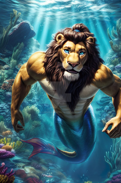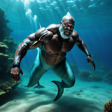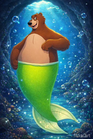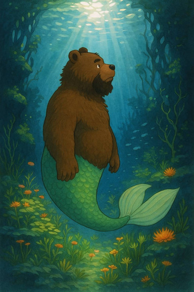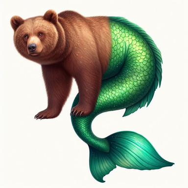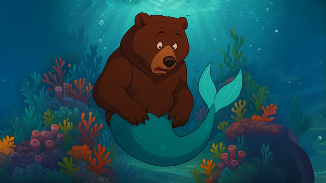 Made using Bing after a bunch of tries."A realistic merbear with the front (head and body) of a brown bear with King Triton's muscles and a green tailfin swimming and hunting in the underwater Rocky Mountains"