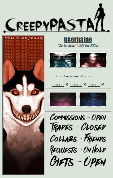 arg i'm tired and lazy imma make this quick: THIS CAN ONLY BE USED IN THE 'DeviantID' WIDGET BECAUSE IT'S SO WIDE (unless you have core membership and you changed it so that the left side thingy is wider than the right... y'all know what i mean) also the * means you can put whatever ya want it doesn't have to be your nickname, age, or gender IT CAN BE YOUR ZODIC SIGN, HEIGHT, AND YOUR RELATIONSHIP STATUS FOR ALL I CARE sorry if that came off mean oop and where it says 'your username,' YOU PUT YOUR USERNAME THERE i'm flooring the shift key today wow