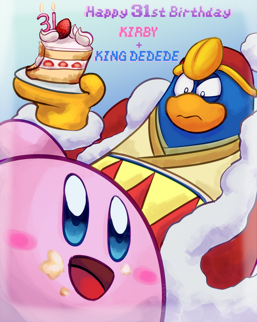 It’s Kirby’s 31st anniversary, and I almost missed it ^^Just a simple doodle of King Dedede chasing Kirby who has cake. Something simple and nice to make for this pink puff ball’s anniversary.