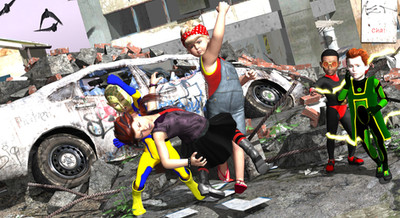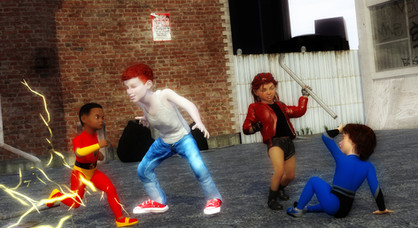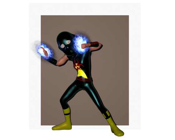 Pistol Pam a city girl who loves play cowgirl. Able to shoot destructive concussive energy from her fingers. Likes to shout "Pew Pew" when using her power. Speaks with a fake southern accent. Ten years old.