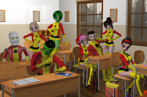 Another long span of work days mean less time to create my own work as well comment on the amazing work of others. So I got an idea while sitting in the break room in my job. I haven't been to movies in a while and thought about my kid characters getting to have the fun I can't. I redid Paige Princess cousin who power is the same except she can't fly. So super strength, durablity,ehanced senses etc. Despite her size she actually the same age as the other kids. Plus one outsider in the second row. So my characters from left to right.Saya Shu AKA Flora
