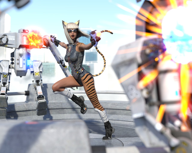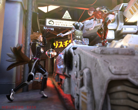 Karen Hong a cat girl living in the year 2066 in the city of New Burg. Her adventures have led to cross several criminal organizations and skirts the law when it suits her. The cyborg enforcers of Spinelli family have caught up to her outside of Randy's Bar her favorite hangout.Karen: Look guys or is it girls? It's hard to tell with cyborgs, this is not what you think. I was on my way home when I came across your friend laying in the street.