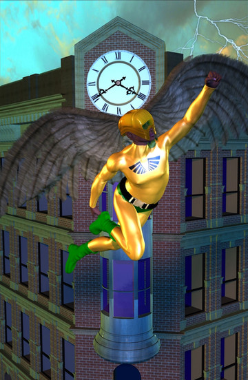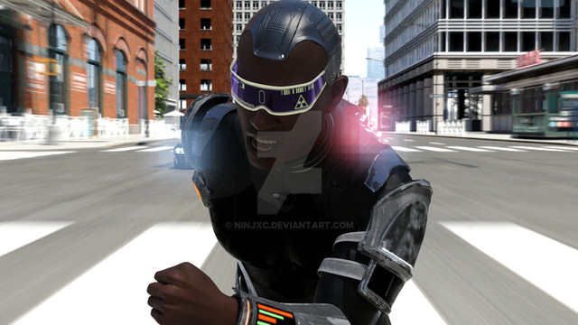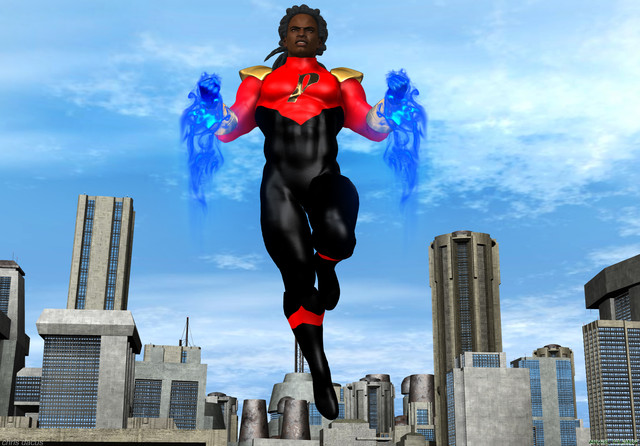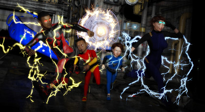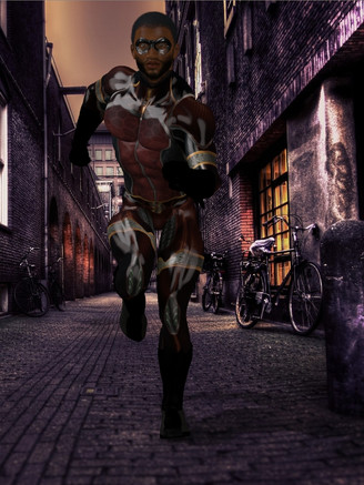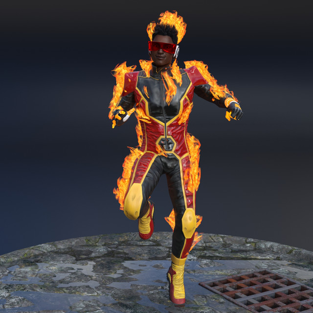 Wanted to try a different look for young speedster Relay AKA Benji Smart. This image shows him showing off his new outfit with his dad fellow speedster RPM as well sometimes good sometimes bad Nonstop who can move as fast as Benji. On the sidewalk are Benji's sister Brianna AKA Outburst along with her super friends Paige and Petunia. Paige the tallest of three has a crush on Benji.