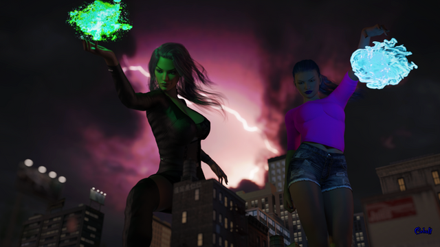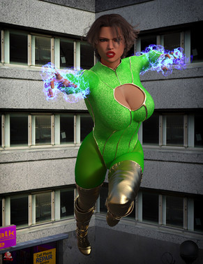 I almost forgot to post this one. This is yet another in my series. Here we have Big Belle a size shifting villain trying to fend off these heroes with a weapon. Her adversaries are the Phillips sisters. The youngest if Pom Pom AKA Pomegranate Phillips with the power to create super powered copies of herself which reflect her own psyche. The middle is TattleTale AKA Nakia Phillips also a size shifter. The oldest is Rebound AKA Odessa Phillips with the ability manipulate the gravity around her body. Decreasing allows her to move like in low gravity and increases her agility. Increasing grants are great strength, durability and a seismic stomp.