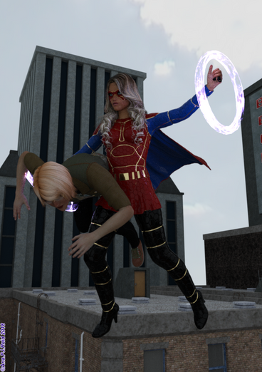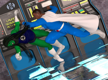 Three heroes returning to base find a group of green random thugs outside the door. From left to right:Rhea Wilson AKA Skylark S class hero flight, super strength, invulnerability, etc. Wife of Wanderer and mother of Princess