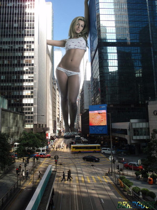 What a beautiful yet kinky model. Her eyes really capture the scene. It's also nice to see a giantess somewhere else besides the city.