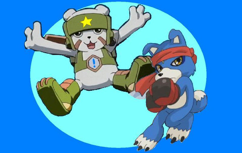 that is cute X3 I made a girl for him I'm still working on her. her name is Bella hyenamon she has a move call the knuckle uppercut she wears boxer shorts she keeps asking him Bella: does these shorts make my butt look big?