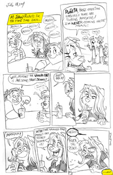 This was the initial sketch I did for 's art trade. I thought it was cool having 2 dudes that deal with monsters AND music having a go with some monster-killing magical guitars.At the end, I thought Track would just complicate the composition so..meh.