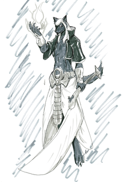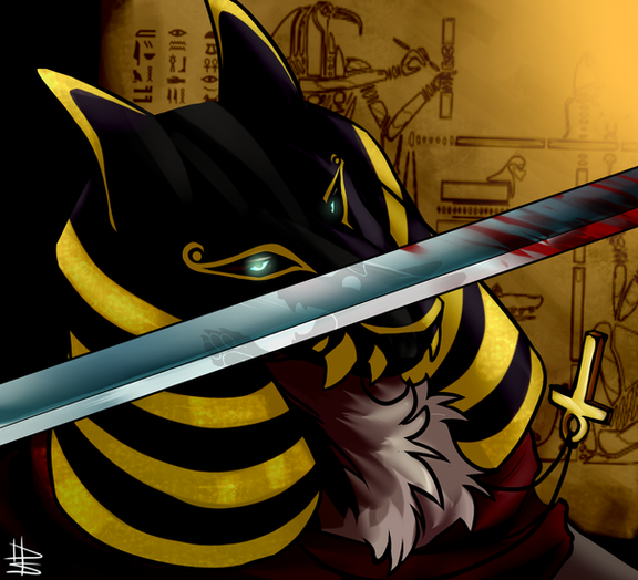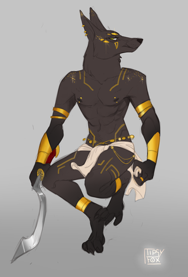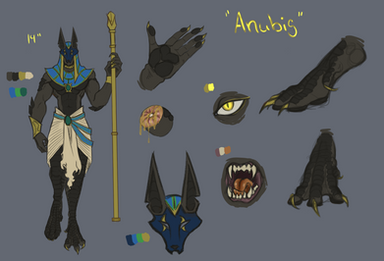 Anubis, gatekeeper of the road between worlds, and guardian of the living. He has been around since the dawn of their galaxy, being one of the three original sibling gods. He had to experience his younger brother, Horus, die by his other brother's hand, Osiris, out of jealousy and greed. Since then, his heart grew darker and darker, and there has always been conflict between himself and Osiris, god of the Underworld.He is the most powerful character in my universe as of yet, and has formadible powers no other character can amount to. I had a lot of fun designing him (finally), and look forward to using him soon~