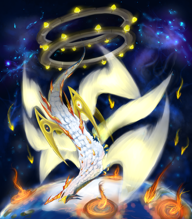 Effect: 2 Level 4 monsters. Once per turn, you can remove one exceed material monster to destroy one of your opponents face up monster. When it is destroyed, inflict 400 points of damage x the number of stars their monster had. When this card is in face up attack mode, your opponents trap and spell cards can not target any light attribute monsters on your side of the field.