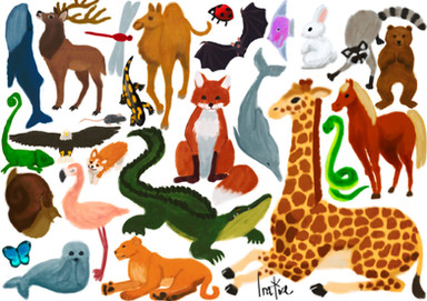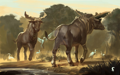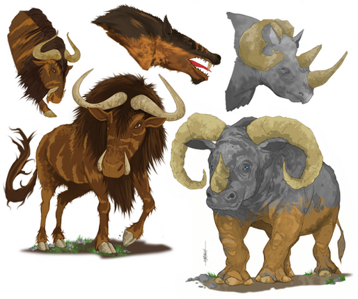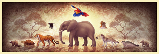 The horse-like animal is a quagga, while the one of the far left is probably a Pyrenean ibex. Next to the dodo is a great auk (killed off to be turned into fish bait and fuel...). The giant bird in the background must be a moa.