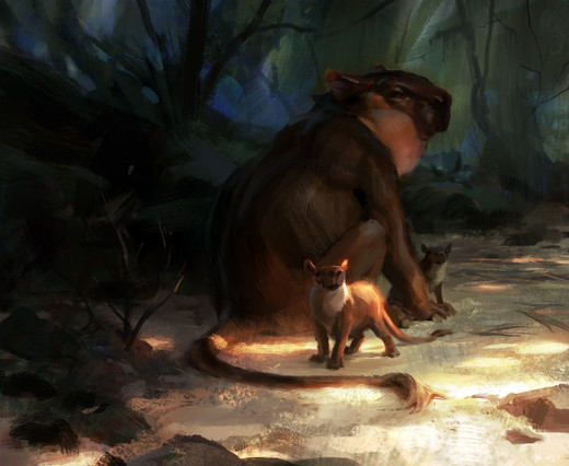 Wow, this is really amazing! I love the lighting but even more the pose. You can see the shoulder muscles used to cling to the tree, and the back legs sprawl out in such an interesting way! I've never seen an animal today do something similar so it takes a lot of talent to bring something to life that looks so natural but also wonderfully strange and unique from other animals. I really admire your work. I'm sure you get asked a lot but I couldn't find anything (maybe I didn't look in the right places) but I'm very curious what brushes you use and what program?