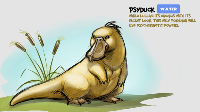 In one Pokemon episode, Ash and his -idiot- Golduck visited a beach. He saw signs that the estupido thing was about to evolve. Soon he saw a psyduck: athletic, likes the ladies, sexy, good-looking. He was quite glad for his golduck.