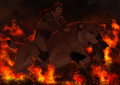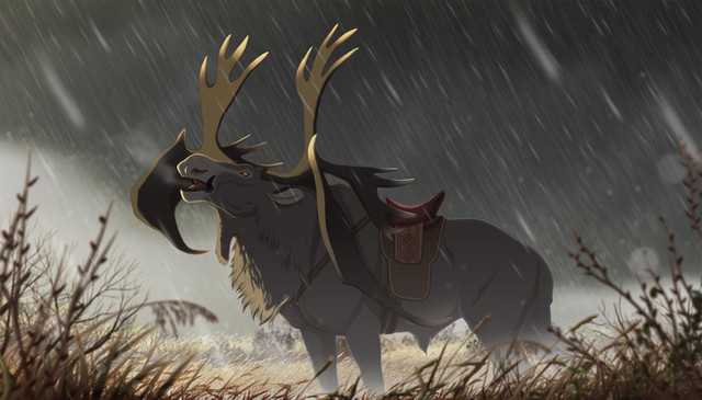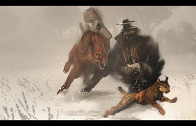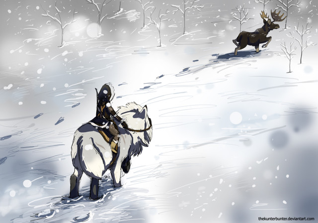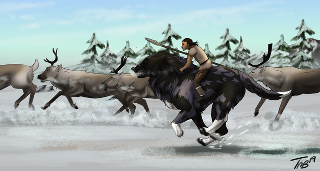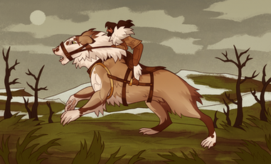 Nice and dynamic picture, with a nice blur on the background while having the foreground/characters looking very crisp and clean. The character looks like a hardened survivor, an I really like the design of the wild boar/saiga/bison-beast mount - the animal looks like something one would expect to live in the cold wilderness.