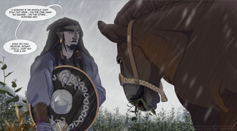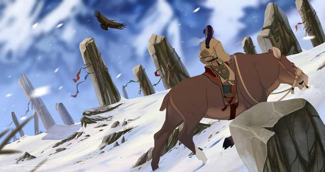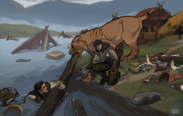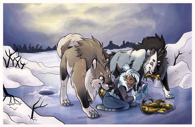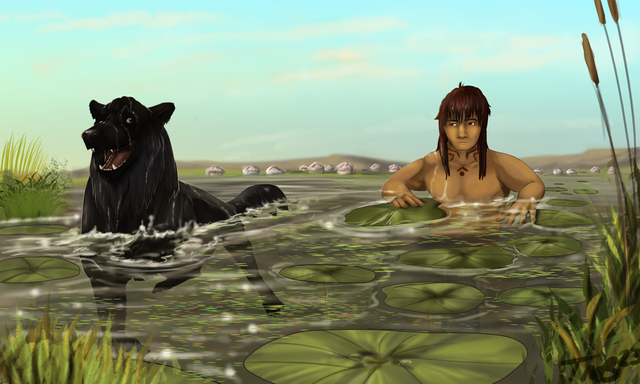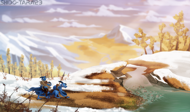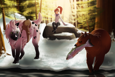 Local hairy man and long otter spotted on the hunt - fish be warnedMore practise that turned into a picture. Mountain/water/tree's/layering background vegetation - threw in a doodle of Kotsu I had and tried to make something of it. Unfortunately now I have snow on one side of the river and none on the other... makes no sense but it was fun.