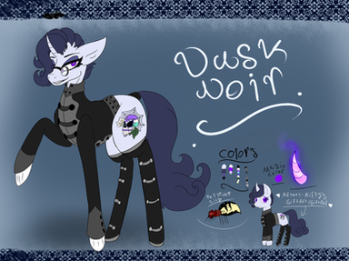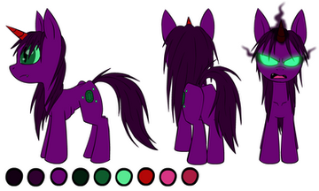 Personality and Facts: Her hair glows purple and flicks/ flashes furiously when she's angry. Despair has very backwards morals, but she's not evil (Think of the Addams Family). She has a dry, dark sense of humor. She will smoke occasionally and likes to use a cigarette holder. She's not addicted to cigarettes though, and might just have one when she's stressed out. She's a Masochist. It's really hard to make her embarrassed. She doesn't know what her talent is (hence no cutie-mark) but she also doesn't care and isn't looking for her talent. She doesn't care if you hate her, but will respect you if you respect her.