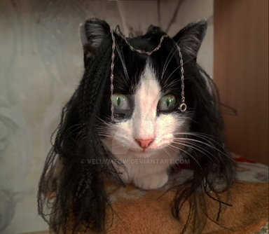I never did get to make DAC's Dracula costume while he was alive so I thought doing a horrible photo-manip in photoshop was the next best thing. lol. Why am I so bad at photomanipulation!? lol I know my way around PS like a champ. O_o Fail my life.The plan was to rig him to some how comfortably hover in front of the door wearing the wig and the cape and being generally awesome for trick-or-treaters.