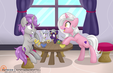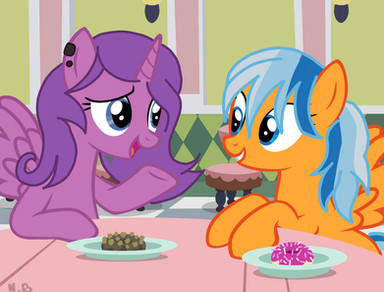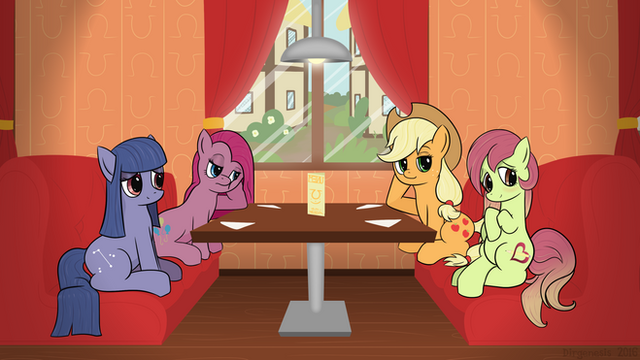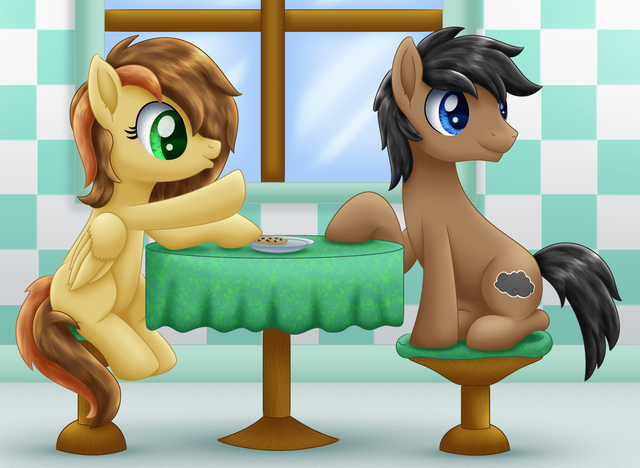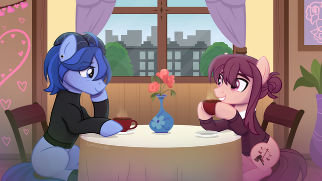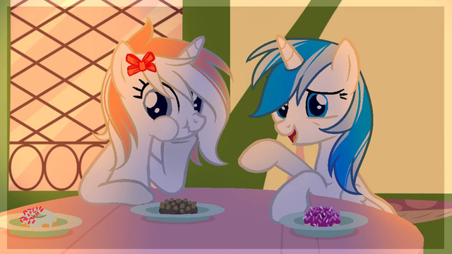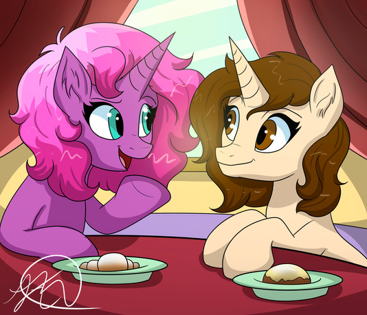 A commission for Faith Sowers featuring her ponysona with her best friend out to dinner ^^